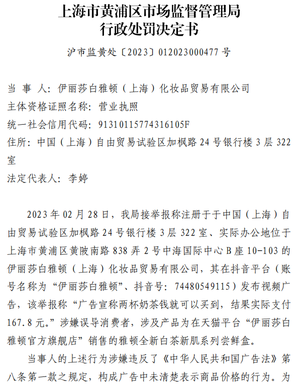 行政处罚决定书显示,伊丽莎白雅顿于 2022 年 2 月 4 日起在抖音平台(账号名称为“伊丽莎白雅顿”、抖音号:74480549115)发布雅顿白茶新肌尝鲜礼盒的视频广告,宣称“……只要两杯奶茶钱,就可以拥有雅顿白茶全套护肤……”,视频下方有一行文字点击可跳转链接至天猫平台“伊丽莎白雅顿官方旗舰店”雅顿全新白茶新肌系列尝鲜盒的购买页面,页面标有新品尝鲜价为 168 元。